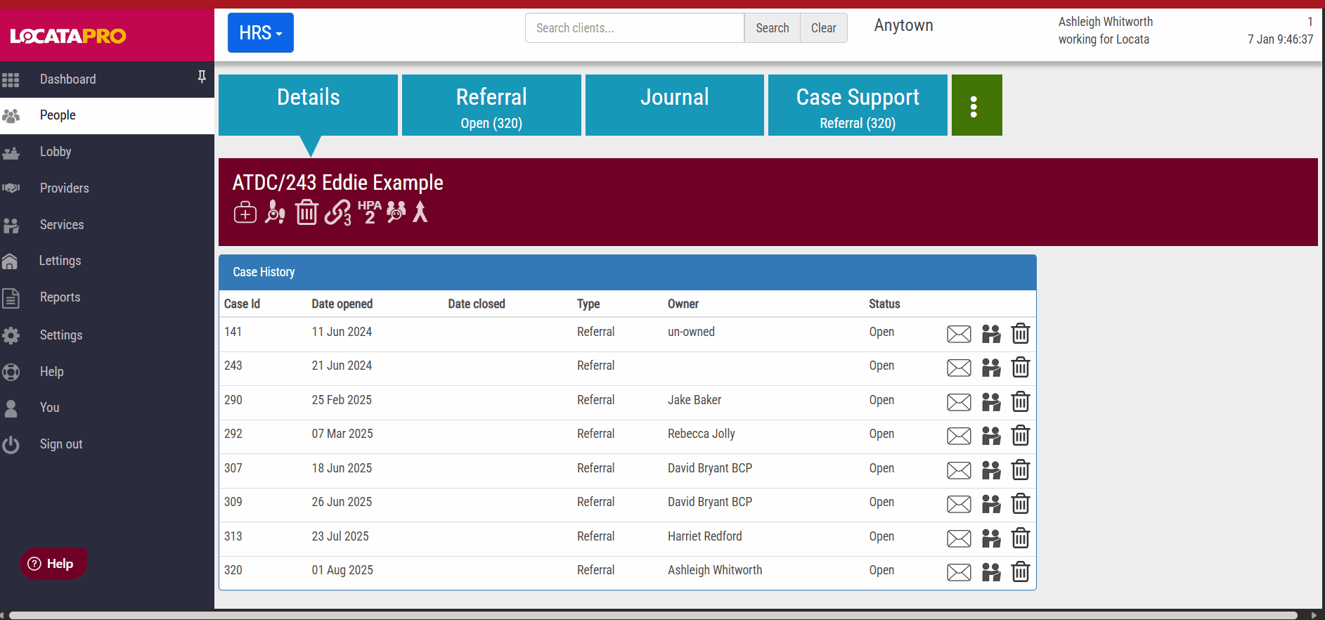 When viewing a clients individual case there are a variety of case management tools available. By hovering over the icon a prompt will display to explain what the icon does: