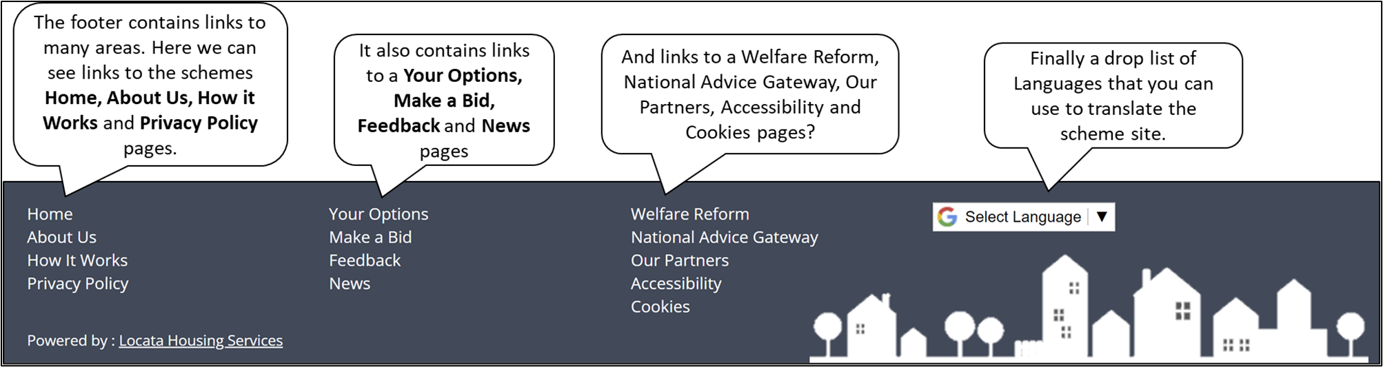To find more help, go to the page's footer. This is the broad bar at the bottom of the home page. It has a lot of useful links to help you with information about the scheme and the site itself. These links are also placed throughout the site, and some are at the top of the homepage.