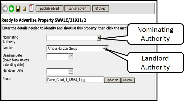 Use the drop down menu for Nominating Authority, please select your local authority. Then use the Landlord drop down menu and pick the local authority or housing association.