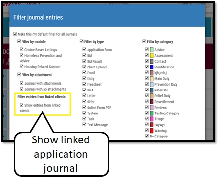Applications that have been linked together have a shared journal view that allows journal notes and actions to be viewed together. This may be an HPA2 application linked with another HPA2 application, a CBL application linked with another CBL application, an HPA2 application linked with a CBL application or any combination of the above.