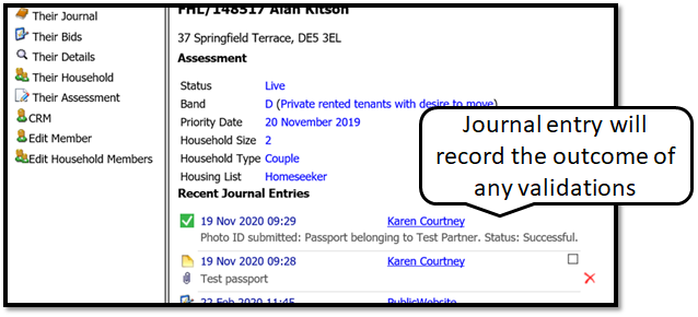 The outcome of the ID validation will show as a journal entry in the customers record.