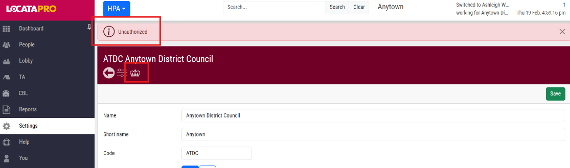 Once you have entered your HCLIC log in information, please select the crown icon at the top of the screen. If your information is correct you will receive a green authorised banner, if incorrect you will receive a red 'unauthorised' banner.
