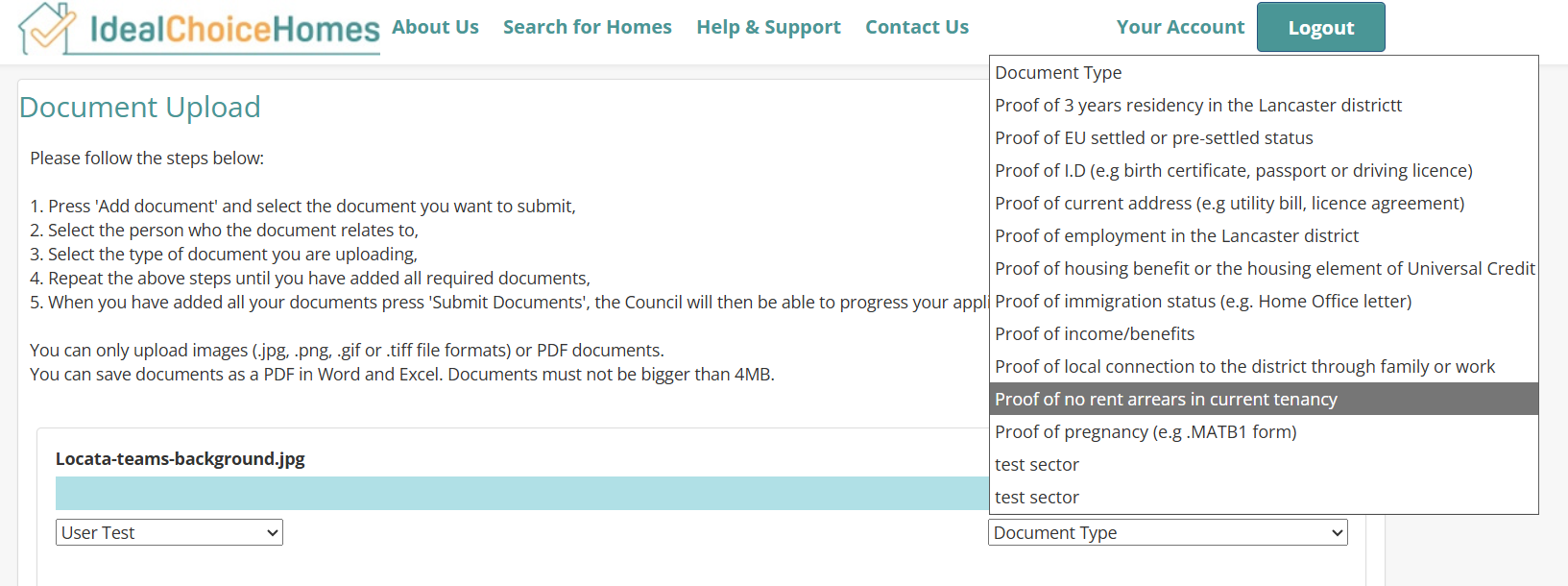 Lettings customers may be required to upload supporting evidence through their online portal. When a customer submits a document, they are asked to choose the relevant document type (e.g. passport, proof of benefits, tenancy agreement). This ensures the evidence is correctly labelled when received in the journal. Creating these document types in Settings ensures the options presented to customers are relevant to your application process.