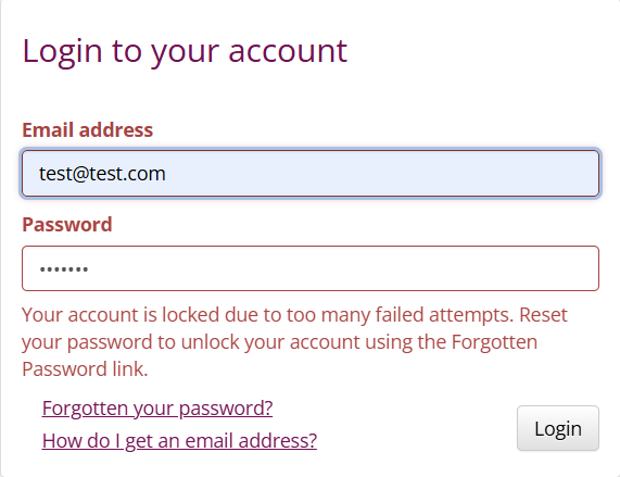 After 5 failed login attempts, the customer’s account will be temporarily locked. Customers can unlock their own account by completing a password reset, or your team can unlock it by resetting the failed login counter.