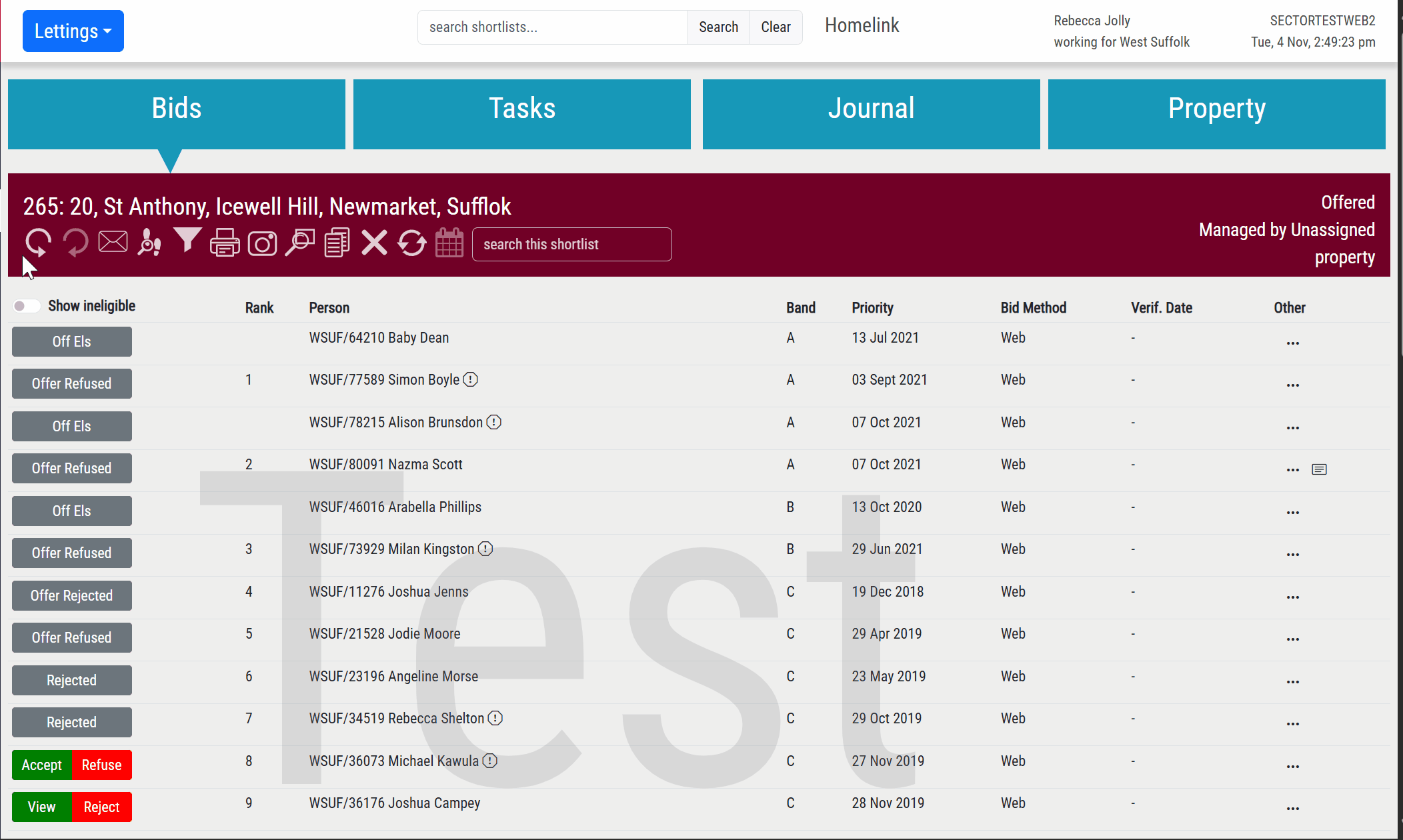 This will reset all the actions that have occurred on the shortlist, setting it back to its original unworked state. It is suggested to set the property to accept until you are sure they are being housed, but resetting the shortlist will allow you to undo your action and show offer/reject. You can then reject and search for another applicant and repeat the steps for adding them to the shortlist again. To reset a shortlist: