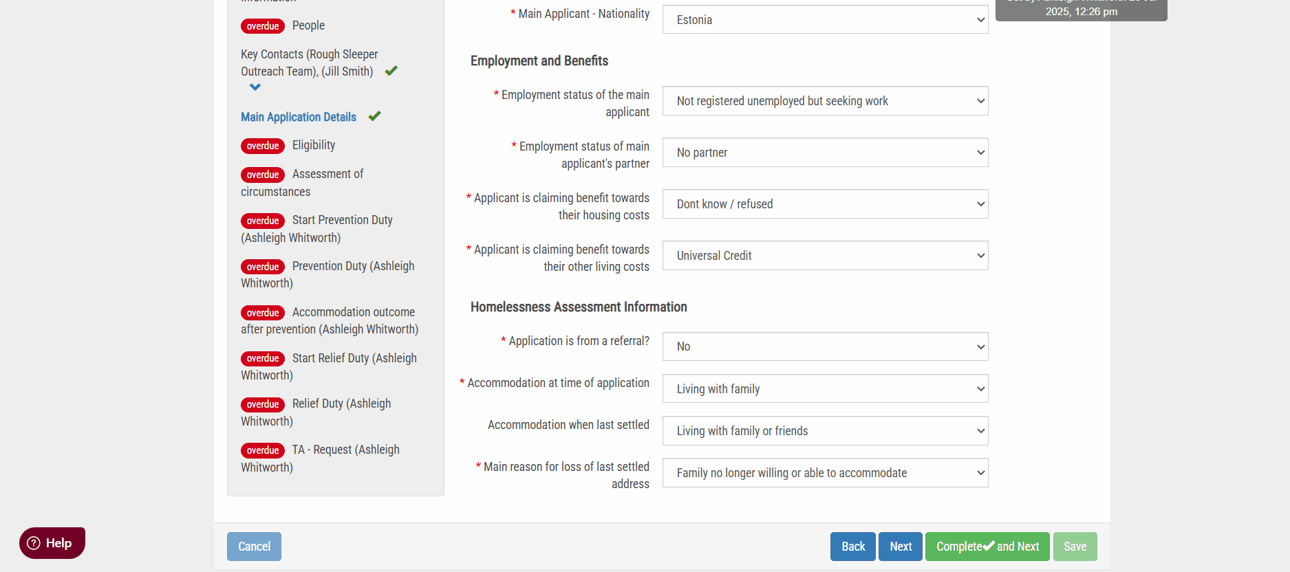Once the flag is set up, it will appear when the attributed answer is selected to the question/element within the workflow. See below, a care flag for Victim of Domestic Abuse appears because the main reason for the loss of last settled address is that they are a victim of domestic abuse.