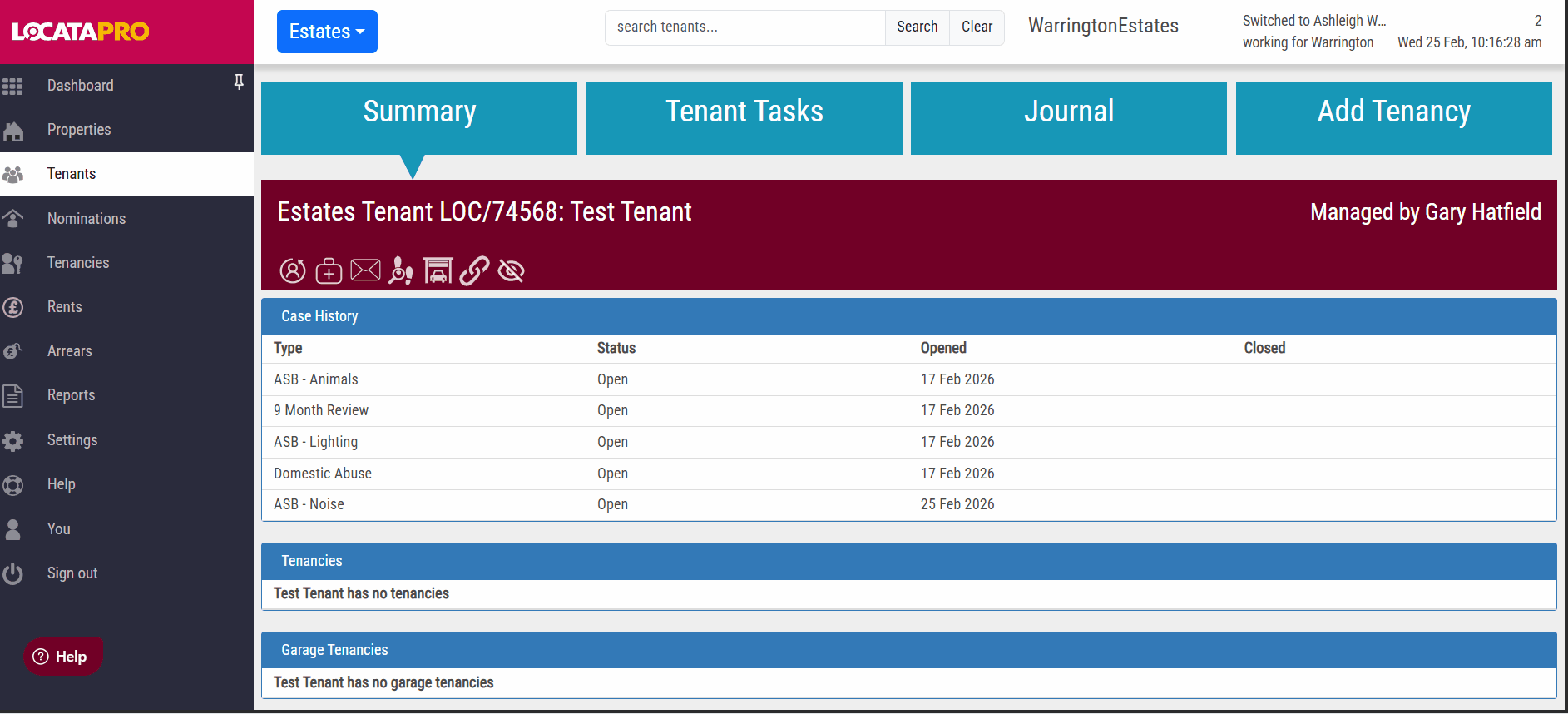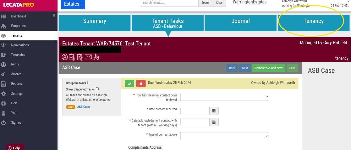 The new case will now appear on screen and be linked to the tenant record.