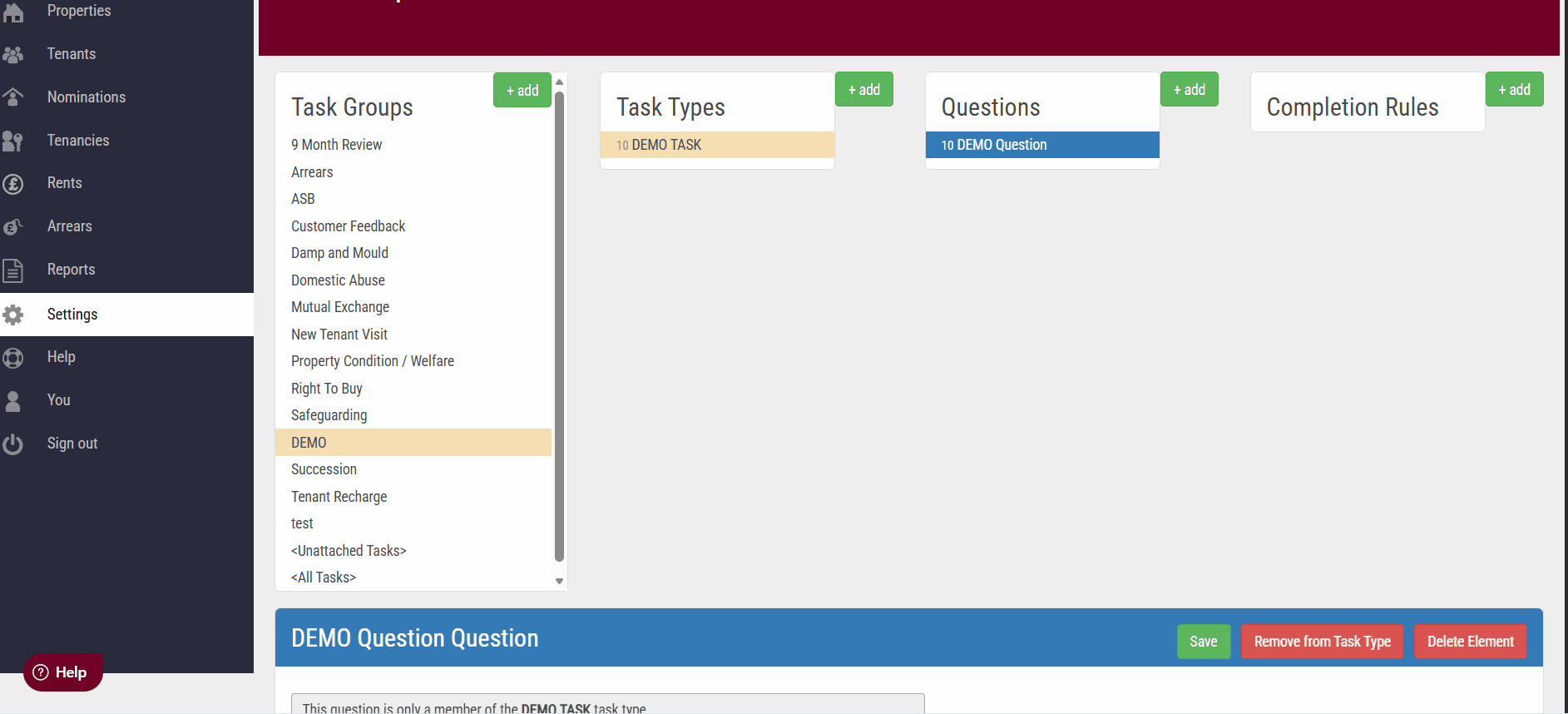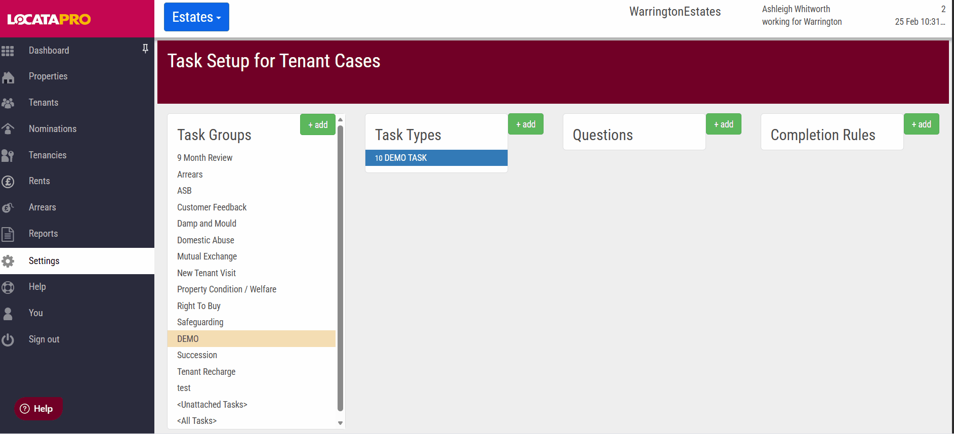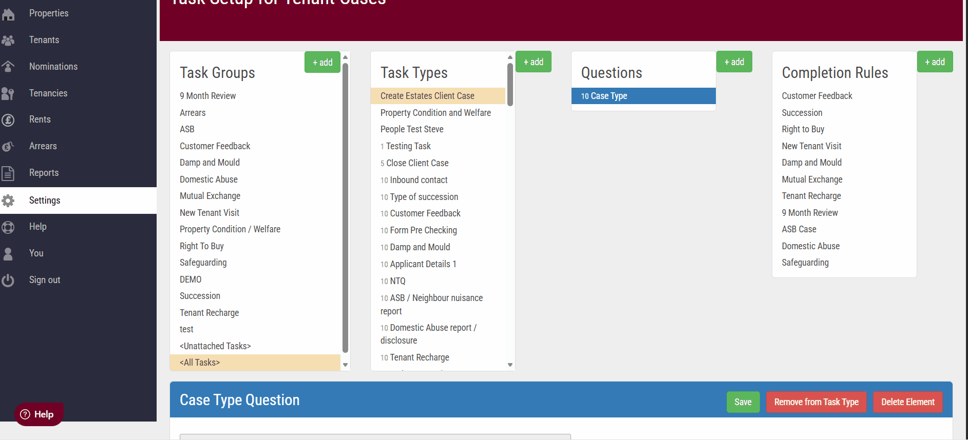 When you open a case type, you will see the associated tasks and questions linked to it only if there is a tenancy (you will be able to see this in the last tab, it will say Tenancy instead of Add Tenancy.