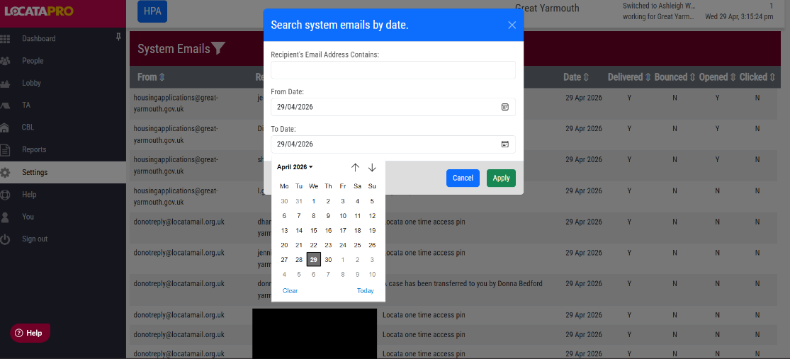 - Click the funnel next to System Emails to filter the results by dates or email addresses.